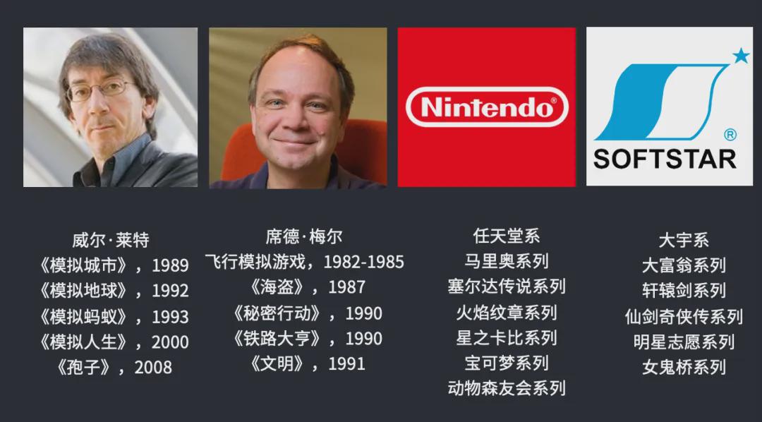 具体来说的话,我比较喜欢威尔·莱特和席德·梅尔。威尔·莱特做试验箱类游戏非常成功,包括我们现在玩的《城市:天际线》,它用的这一套模式其实跟1989年他做的《模拟城市》没有太大出入。席德·梅尔的《文明》,其实是把人类的遗迹和科技树用一种非常奇特的方式整理成了一个思维殿堂,解构之后又重新展现给玩家。