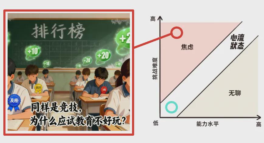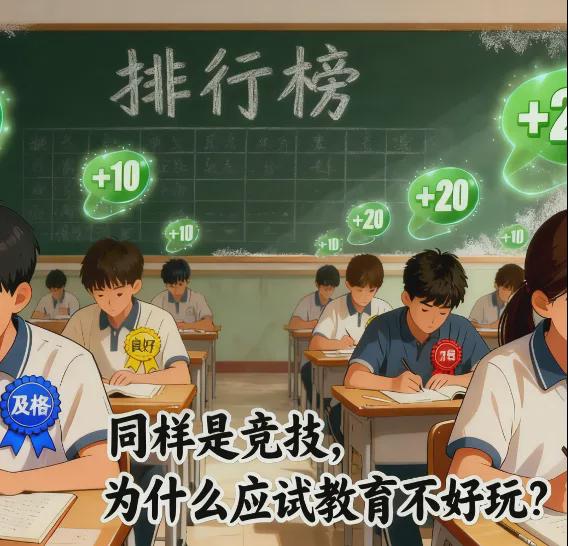 应试教育其实也是一种游戏。我们每一次考试,答对一道题,就会给我们一定的积分,然后我们会根据我们的积分,来获得一些成就徽章,比如说及格、良好、优秀和优+。每次考完试,我们会以班级和学校为单位形成排行榜。为什么应试教育不会让我们成瘾呢?