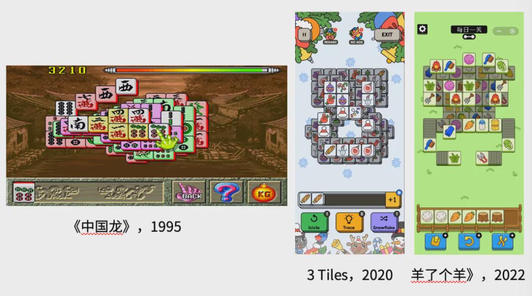 图中现在有三个游戏:《中国龙》、3Tiles 和《羊了个羊》。它们的玩法非常一致,就是你要把牌放到下面的7个暂存槽里,只要有3个一样的牌,这3张牌就会消去,你的目标是把所有的牌都清掉。