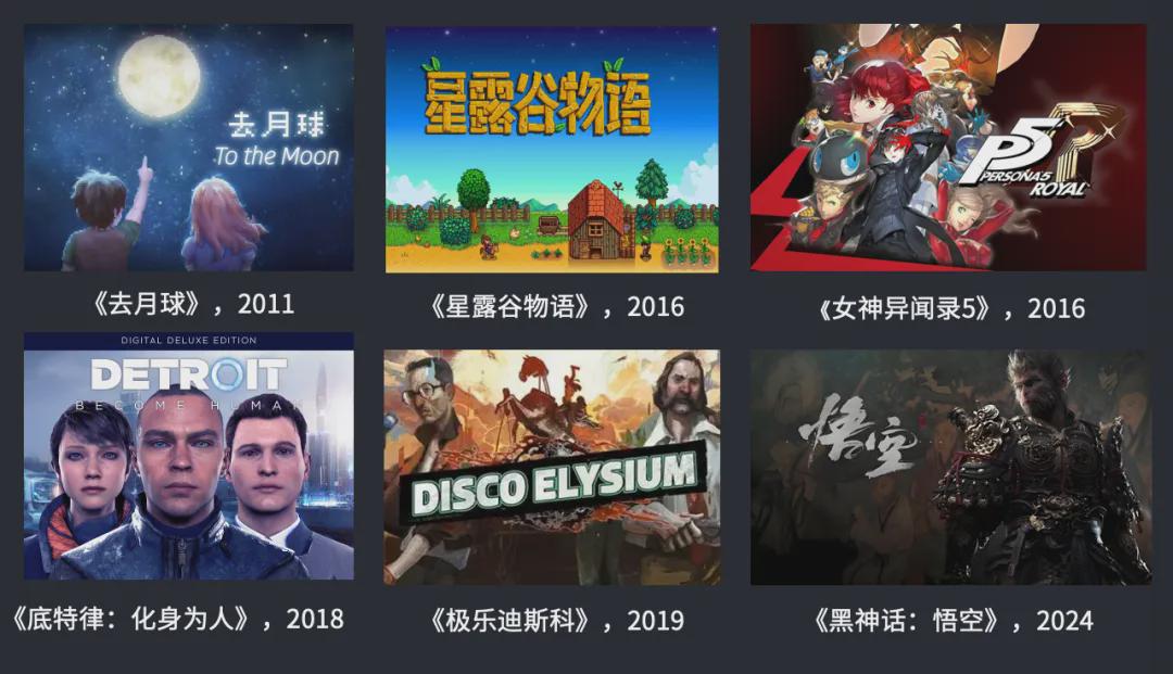 首先它们的叙事都很好。《极乐迪斯科》跟文学和哲学结合得特别好;《底特律:化身为人》它是一个互动电影游戏,它跟电影媒介结合非常好;《黑神话:悟空》是去年刚出的一个作品,推荐游戏一般都是要推5年以上的,但是它是我们国家第一个3A,我觉得它的主题非常好,叫做 “ 天命人 ” 。
