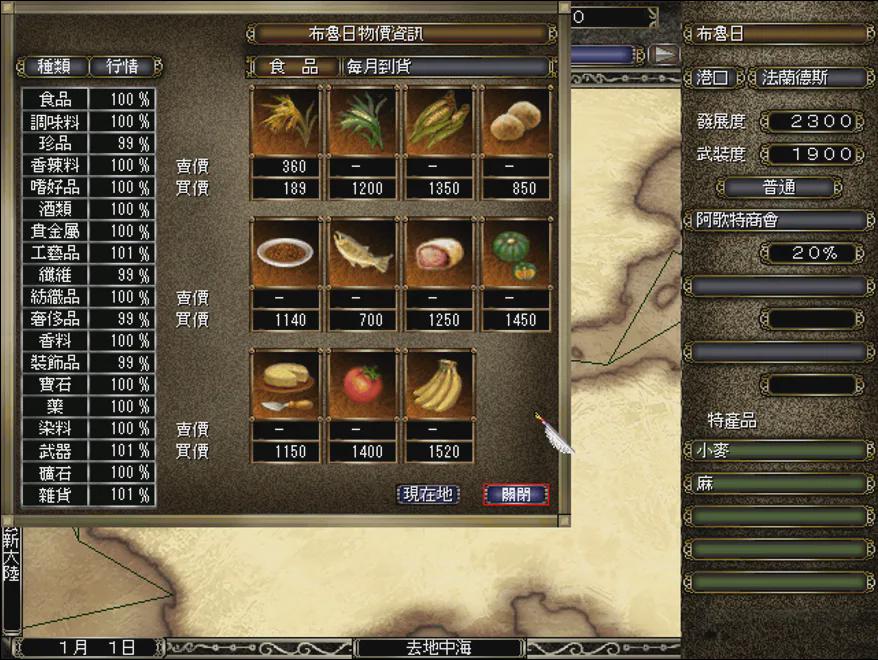 大家看图中左边的这个城市是伦敦,伦敦东南面的这个城市它叫做布鲁日。在游戏当中,布鲁日的特产是麻和麻制品,因为布鲁日是欧洲的一个产麻基地,它有一种麻制品特别出名,叫做蕾丝。你会发现,这么多年过去了之后,我这些港口在地图上的位置以及它们的特产记忆都非常清晰。