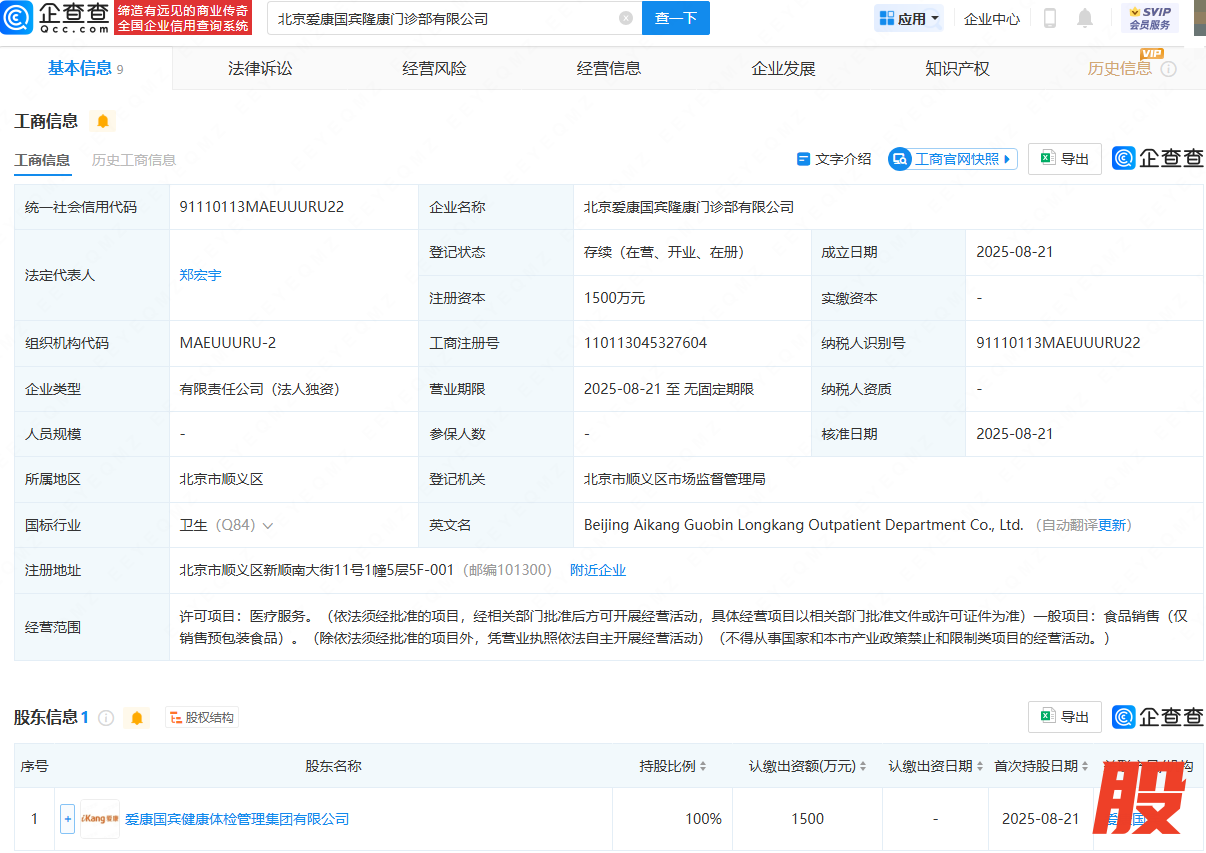 近日,北京爱康国宾隆康门诊部有限公司成立,法定代表人为郑宏宇,注册资本为1500万元,经营范围包含:医疗服务;食品销售(仅销售预包装食品)。企查查股权穿透显示,该公司由爱康国宾健康体检管理集团有限公司全资持股。