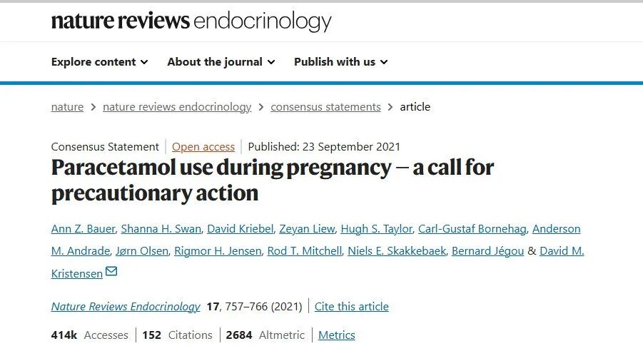 早在2021年,发表在《自然评论内分泌学》杂志上的一份文章指出,越来越多的研究表明,产前接触对乙酰氨基酚可能会改变胎儿发育,并增加神经发育、生殖和泌尿生殖系统疾病的风险。
