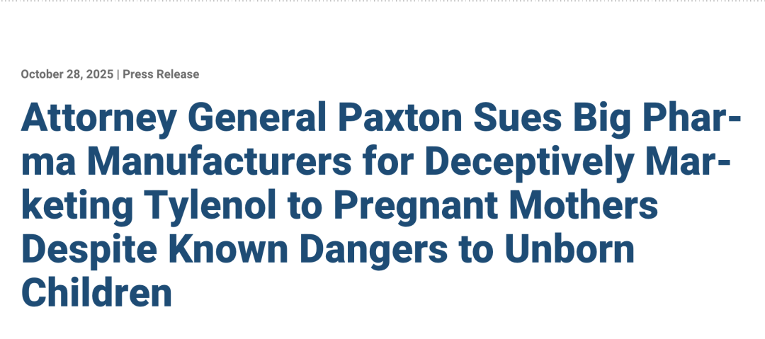 10月28日,美国得克萨斯州总检察长对强生及泰诺运营方Kenvue发起诉讼,指控两家企业隐瞒“泰诺成分对乙酰氨基酚或增儿童自闭症”的风险,仍持续向孕妇推销。