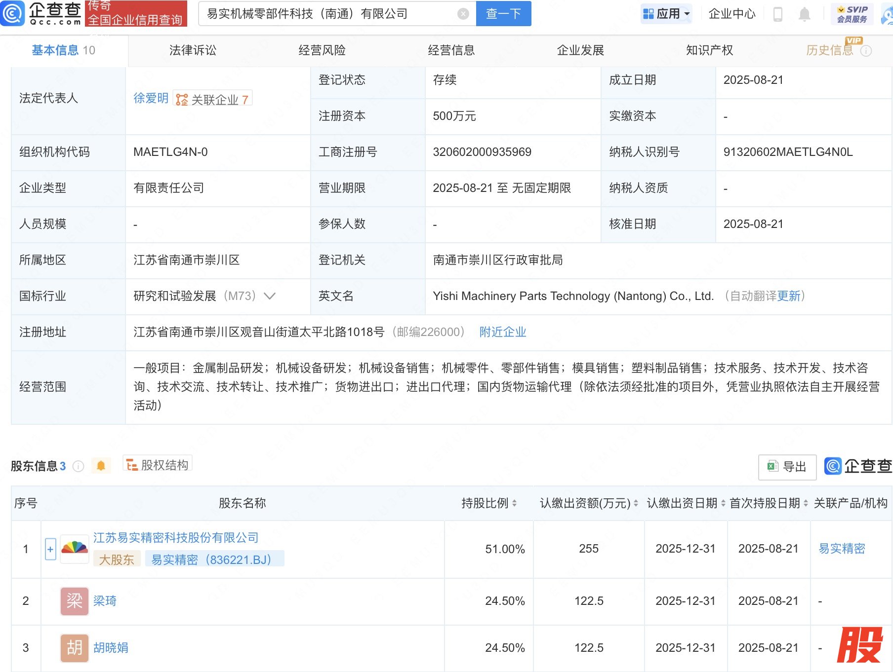 近日,易实机械零部件科技(南通)有限公司成立,法定代表人为徐爱明,经营范围包括金属制品研发、机械设备研发、机械设备销售等。企查查股权穿透显示,该公司由易实精密(836221)等共同持股。
