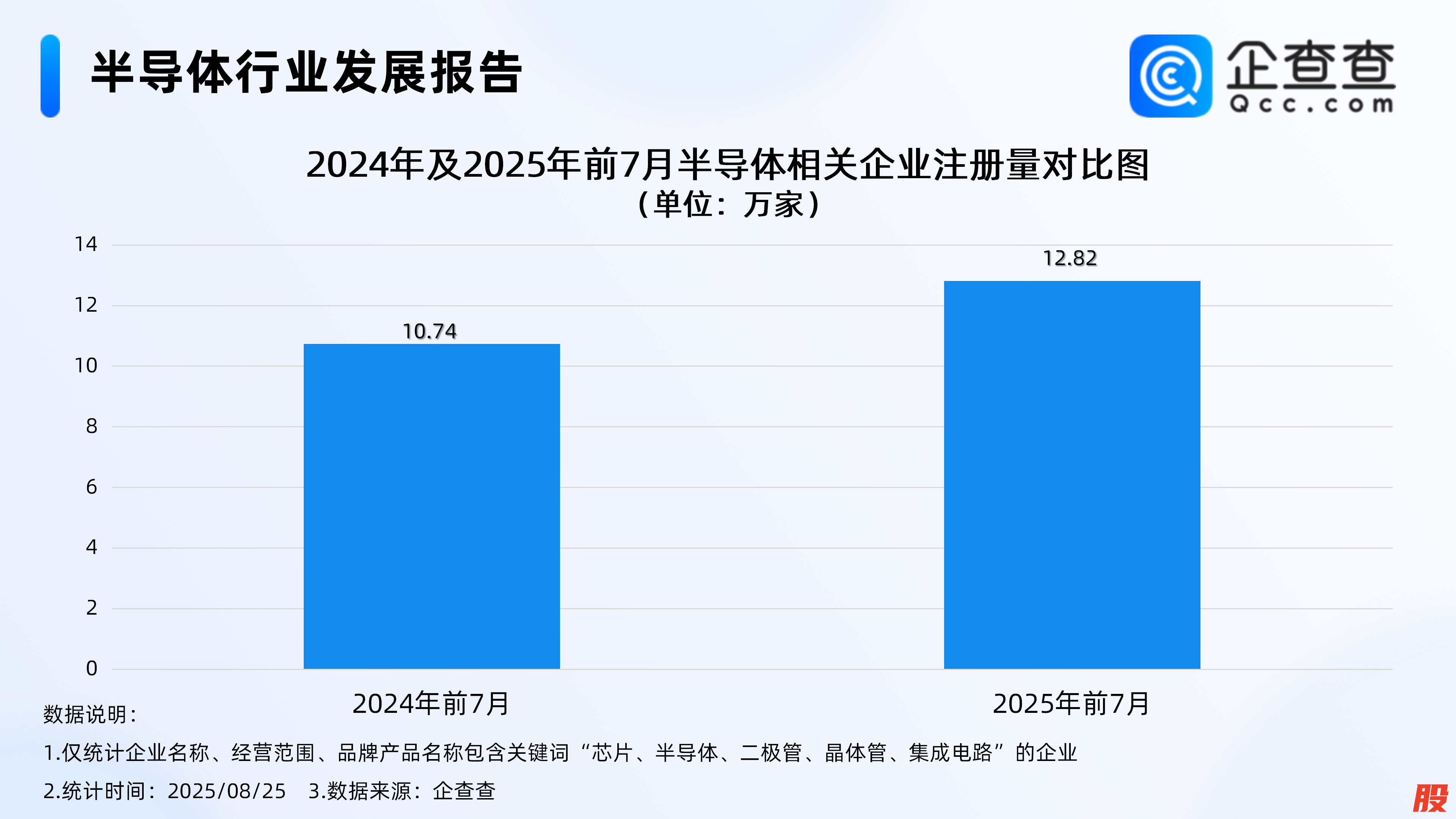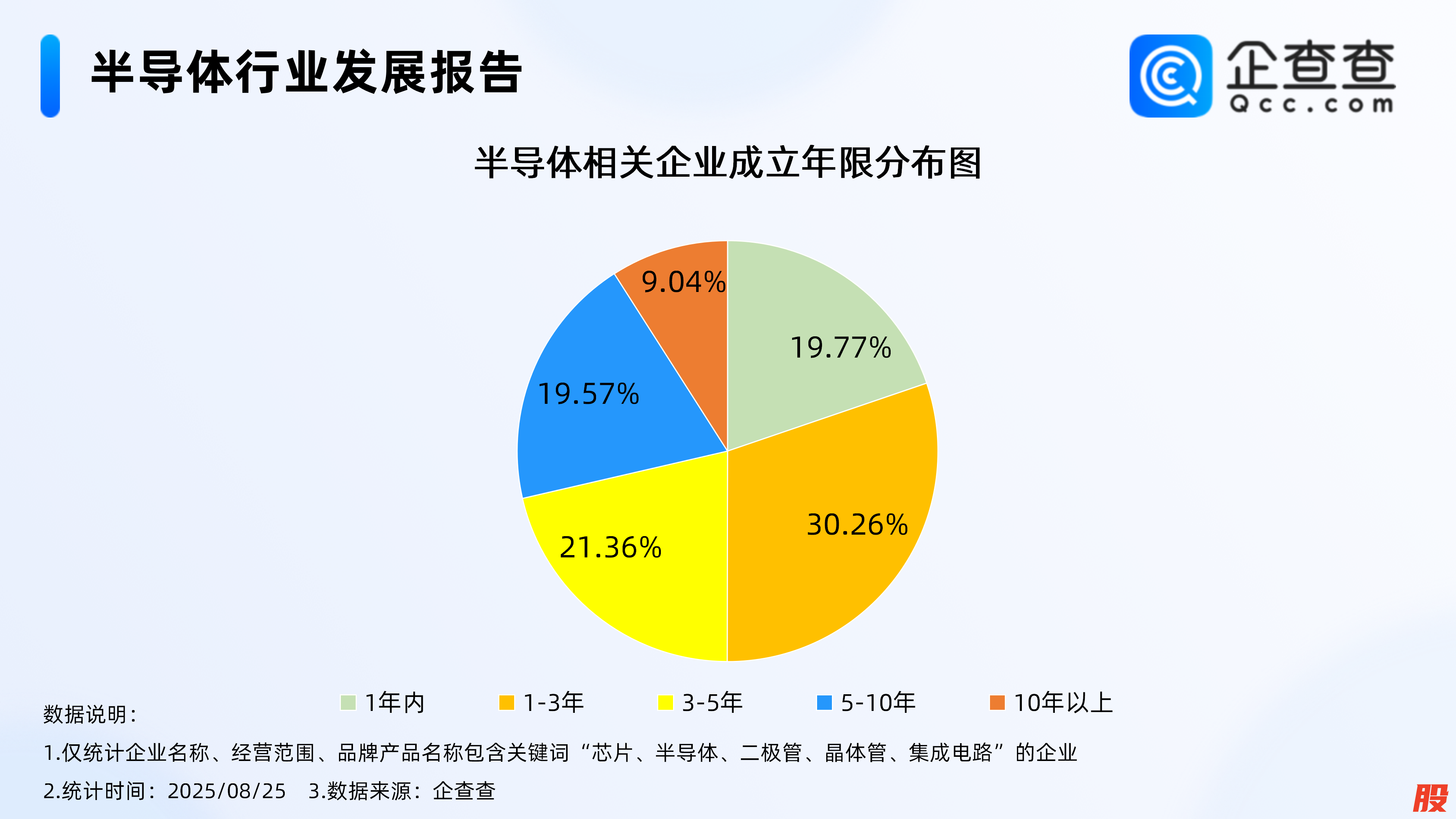 近期,芯片股拉升走势引发公众关注,其中,8月25日,寒武纪再度大涨,最高价一度冲至1391元/股,再创历史新高,市值超5800亿元,寒武纪的大涨使得其创始人身家超过1500亿元。中原证券认为,目前国内半导体设备及零部件国产化率仍然相对较低,国产化率较低的环节及具备突破先进制程能力的公司有望充分受益。先进封装是提升芯片性能的关键技术,适用于先进AI算力芯片,将助力于AI算力升级浪潮。国产AI算力芯片厂商不断追赶海外龙头厂商,迎来黄金发展期。企查查数据显示,国内现存半导体相关企业105.62万家。注册量方面,近十年相关企业注册量呈整体增长态势,2024年全年注册19.46万家。截至目前,今年已注册14.2万家相关企业,其中前7月注册12.82万家,同比增长19.34%。存量方面,从经营时间来看,成立年限在1-3年的半导体相关企业最多,占比30.26%。从城市线级分布来看,分布在一线城市的相关企业最多,占比30.37%。1.现存半导体相关企业105.62万家